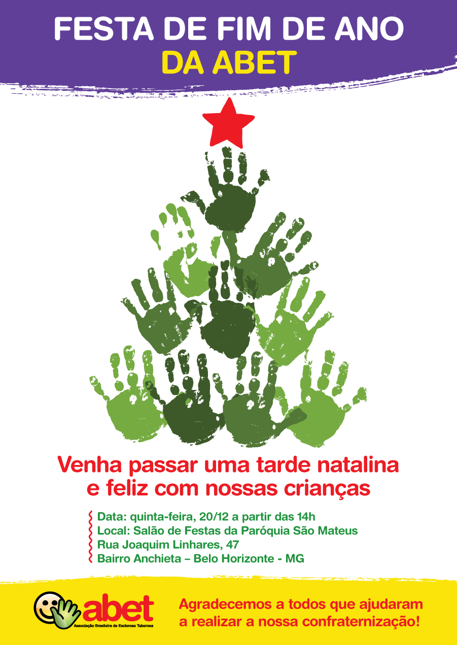 A Abet é uma Associação Brasileira voltada para o tratamento da Esclerose Tuberosa e para a qual venho prestando um serviço voluntário para a sua comunicação institucional. No final do ano 2008, a Abet convidava as famílias impactadas pela doença, voluntários, amigos e empresas parceiras da instituição para ajudar na realização da sua festa de fim de ano. A partir de um ícone que compõe a sua logomarca, uma mãozinha, pensamos em multiplicar essas mãos formando imagens natalinas, como a árvore de natal e uma guirlanda a fim de representando graficamente as várias ajudas, a união de várias mãos na realização do evento.